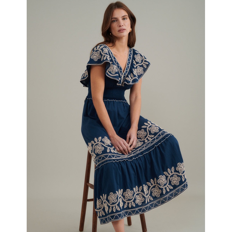 Navy Floral Embroidered Tiered Suzie Midi Dress