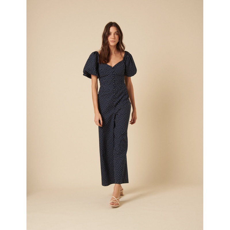The ultimate outfit in an instant. This one comes in a navy polka dot print. Dont miss the sweetheart neckline, subtle pleats at the wide leg and short fluttery sleeves. Style with sandals.Sweetheart necklineShort sleeves