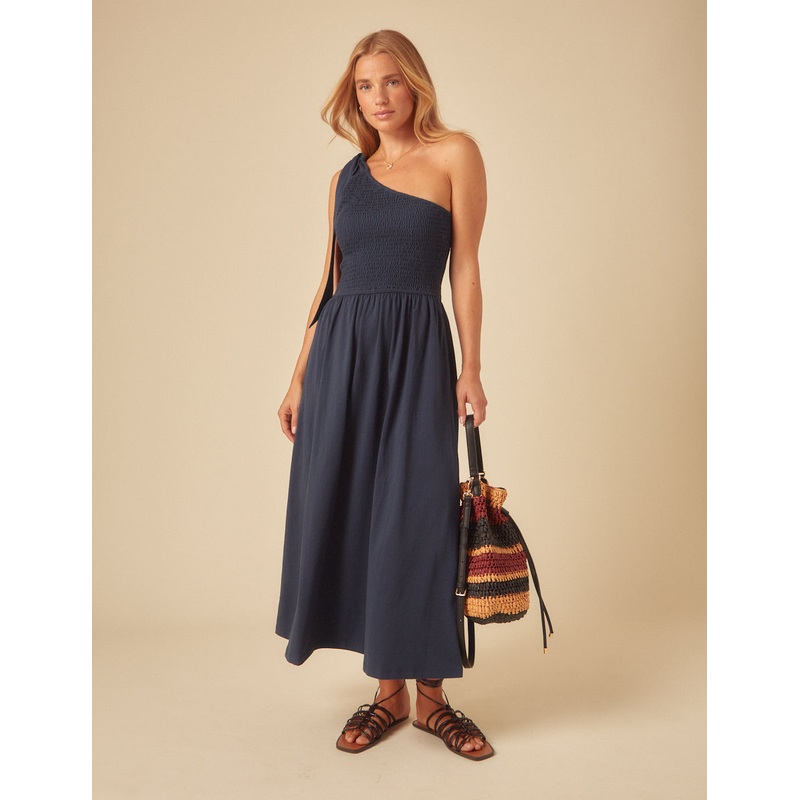 A one shoulder moment. Coming in a deep navy, our dress is designed with shirred bodice for maximum comfort and bow detail at the one shoulder. It falls to a swishy tiered skirt thats perfect for everyday. Style with sandals.