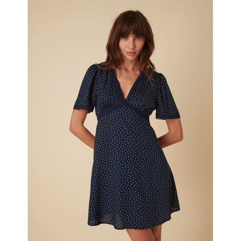 Where wont you wear our Kharian mini dress? Designed in a classic navy polka dot print, we love the lace detail at the bodice and the tie to the back for the perfect fit. Weve styled her with barely-there heels for an event-ready look.