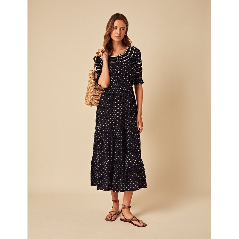 Meet your new favourite. Our Peyton floral print dress brings effortless prairie vibes. We love the white embroidered trims and soft puff sleeves. Style with sandals. Crew neck Collar Mid-length sleeves Elasticated waist for comfort Designed for a relaxed