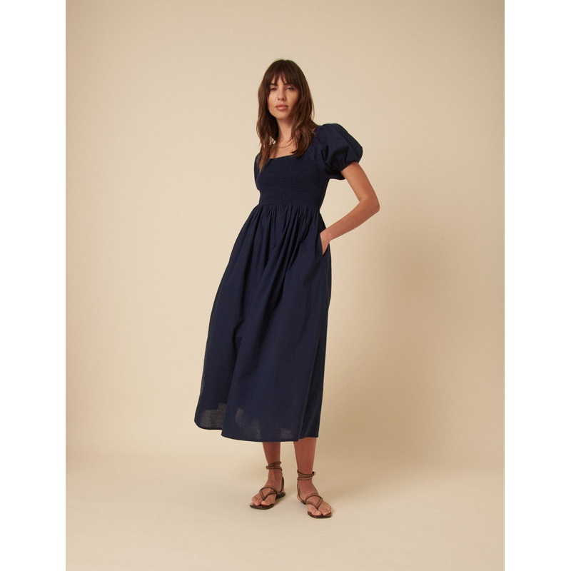 A moment for Tasmin. The ultimate throw-on-and go dress. Coming in classic navy we love the elasticated bodice and puffed sleeves. She falls to an elegant midi. Style with sandals.Square neckFitted bodice that defines the waist Short puff sleevesConcealed