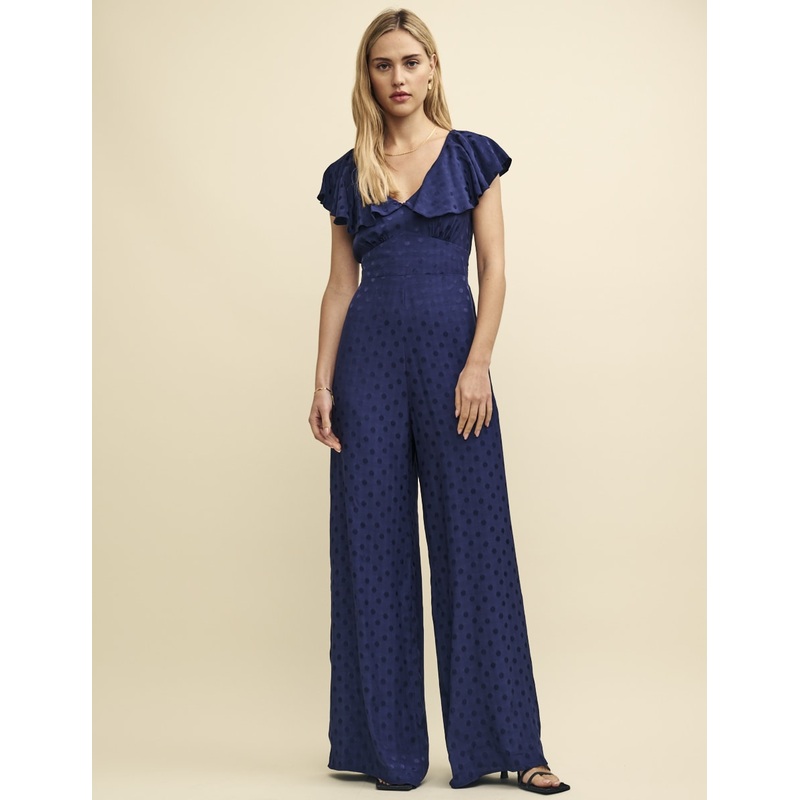 So 70s, so now. In navy satin jacquard, this stylish jumpsuit comes ruffled with a flouncy collar designed to float across your shoulders. A fitted waistline pulls you in before kicking out effortlessly to a pair of wide trousers. The fact Sukis as pretty from the front as she is from the back isnt to be overlooked. Team yours with barely-there sandals.