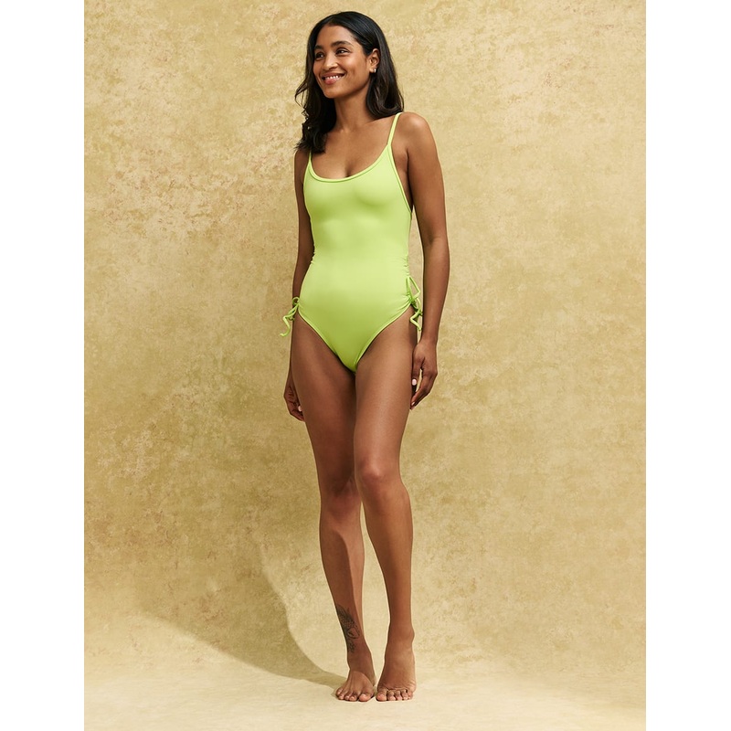 Our Lindsey swimsuit exudes confidence in lime green. This has been blended with a touch of stretch for an always perfect fit. Adjust the side ruching via the ties at the side. Wear yours by the pool with faded high waisted denim shorts.