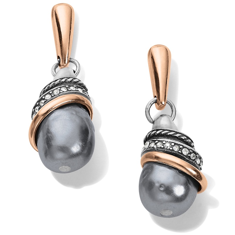 Baroque pearls are topped by a tumble of mixed metal rings, including touches of feminine rose gold. These drop earrings are ideal for wearing with everyday looks as well as dressy attire!
