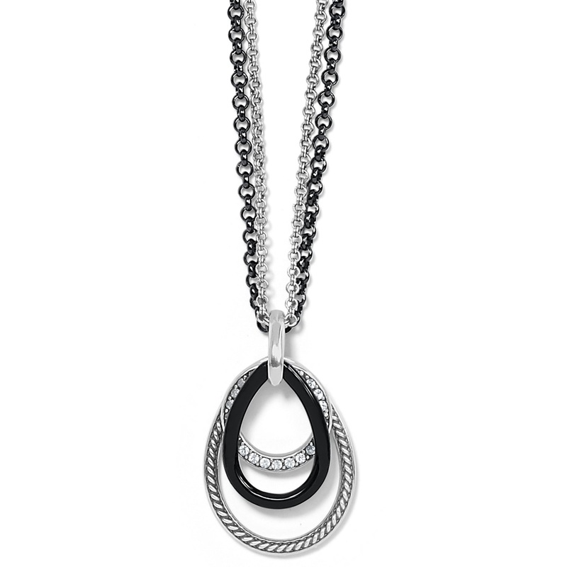 A trio of elegant open shapes create beautiful symmetry on this multi-tone necklace.Style: #JM4053Collection: Neptune's RingsColor: Silver-BlackClosure: Lobster ClawLength: 28" - 31" AdjustablePendant Drop: 1 1/2"Material: Fine quality crystal, EnamelFinis