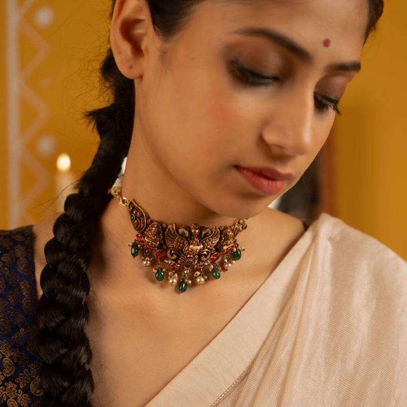 The netra choker carries elements of the past and makes them relevant for today with their refined design and a beautifully composed riot of colours that reflect our design ideology! Handcrafted in antique gold plated silver, the piece features pink kundans around a central dancing peacock piece, finished with cultured pearl and gemstone danglings.