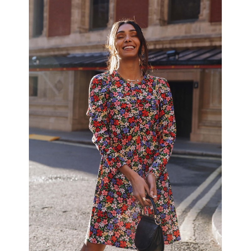 Our 70s-inspired Nicola dress is all about the romantic vibes. With a cute mini frame, it features long sleeves, a bold animal print and ruching on the front. Complete with a concealed zip fastening on the back, dress it up or down and team with your favourite boots.