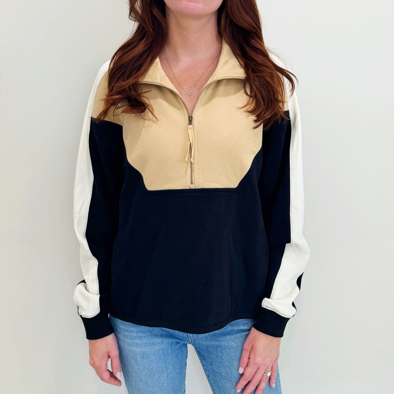 Color combo quarter zip fleece.Black, Tan, and WhiteRuns true to size with a little room