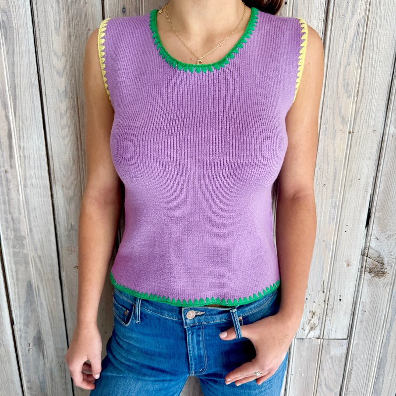 Mardi Gras Knit Tank.Fits true so size, model is wearing size small.