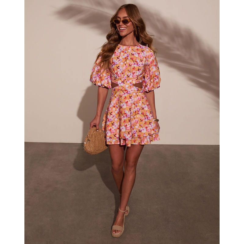 Cue the vacation vibes, the Nomadic Charm Floral Cut Out Mini Dress is ready to turn heads from brunch patios to beach sunsets. With its flirty puff sleeves, breezy side cut-outs, and an open back with a delicate tie detail, this dress brings effortless bo
