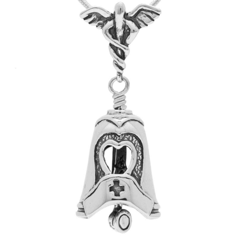 Handcrafted in Sterling Silver, the sterling silver Nurse Bell Pendant features a heart cutout behind a classic nurse's hat. The bail is in the shape of a Caduceus and the clapper is a Stethoscope.A gift to show that special nurse they are loved and apprec