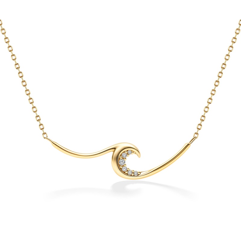 14K Yellow Gold Ocean Swell Necklace with 0.05 Carats (total weight) of Diamonds. The necklace measures approximately 18″. The Ocean Swell measures approximately 1 3/16″ in total width.