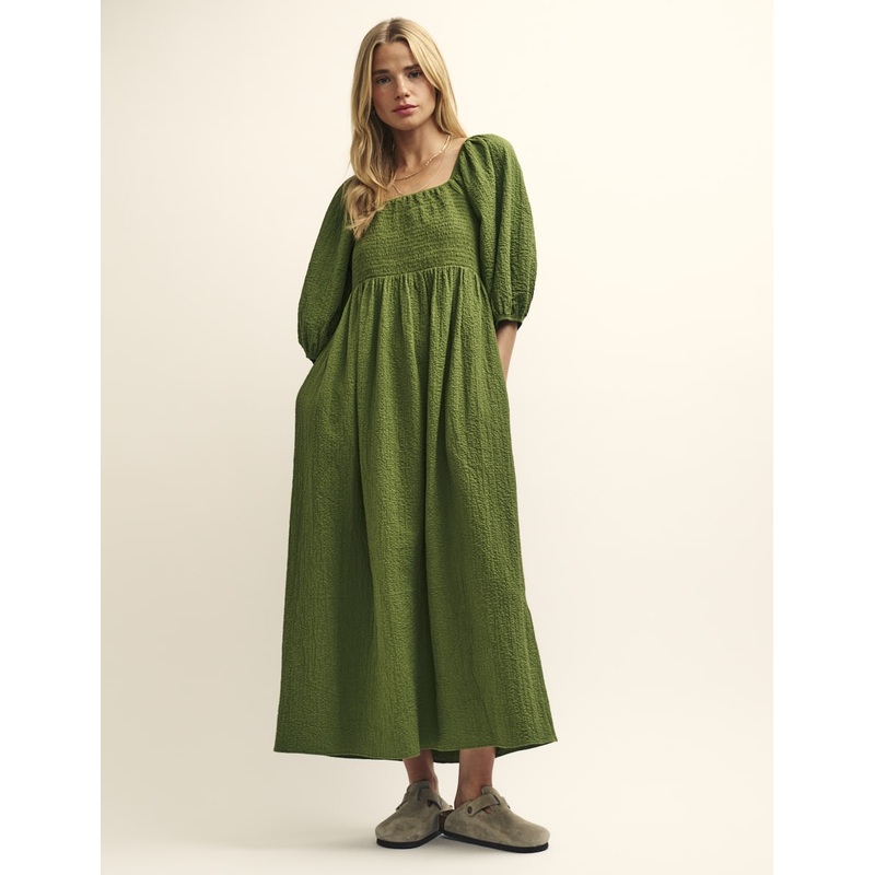 Make space in your wardrobe for our Kylie smock dress in forest green. She features side pockets and voluminous sleeves. Were wearing ours with suede slip-ons.Square neckMid-length puff sleevesSide pocketsShirred waist designed to flatterRelaxed skirt that