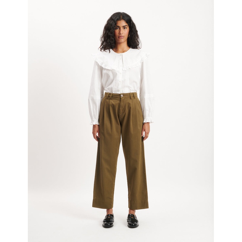 The definition of relaxed tailoring. These khaki tapered trousers sit high on the waist with a double pleat front and stylish wide leg. Switch between retro trainers or stompy boots.