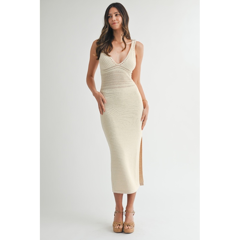 Openwork crochet knit deep v-neckline open back self tie bodycon midi dress. Fabric Contents58% ACRYLIC 42% NYLON