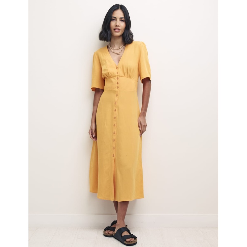 Our trophy style in soft orange. Alexa is all about the vintage-inspired details, from the tea dress cut to the delicate covered buttons. This one drapes like a dream. Weve also added a subtle shirred back to gently pull you in at the waist. Finish off the look with sandals.
