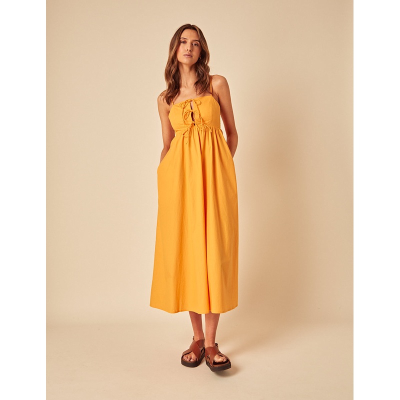Sun-drenched styling at its best. Coming in orange, our Aspen midi dress features delicate spaghetti straps and a trio of ties at the bodice. We love the relaxed fit - shes perfect for long summer days. Just add sandals. Square neck Adjustable spaghetti st