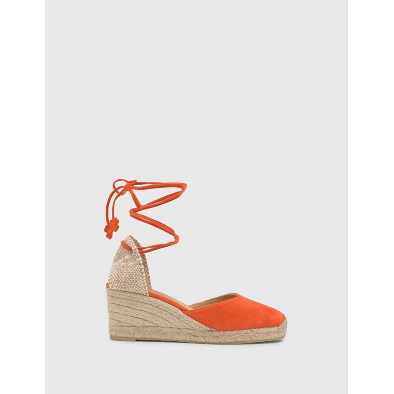 Bright move. In bold orange suede, Castaer's Carina wedges are made for sunny days, just tie at the ankle and add your favourite summer dress. By Castaer Wedge style Tie fastening