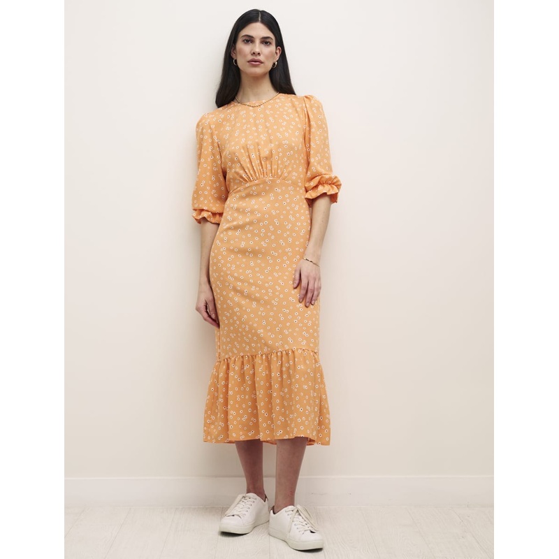 Another Selena day dress for your collection, re-edited in a peach floral print. Shes softly shaped with a floaty tiered hem. Her mid-length sleeves have been finished with an elasticated ruffle cuff, cleverly designed so it can be adjusted to just your desired length. Style with trainers, chunky boots or heels.