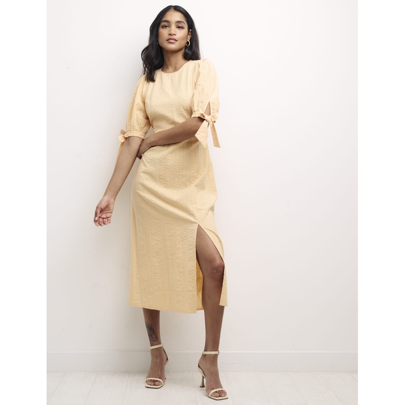 Putting a vintage twist on a classic style, our Esme midi is the ultimate tea dress. The sunkissed peach fabric comes lightly textured with a nipped-in waist and subtle side slit. Shes elevated by puff sleeves trimmed with a self-tie bow and shirring on the back. Dress her up with barely-there sandals or pare the whole look back with trainers.