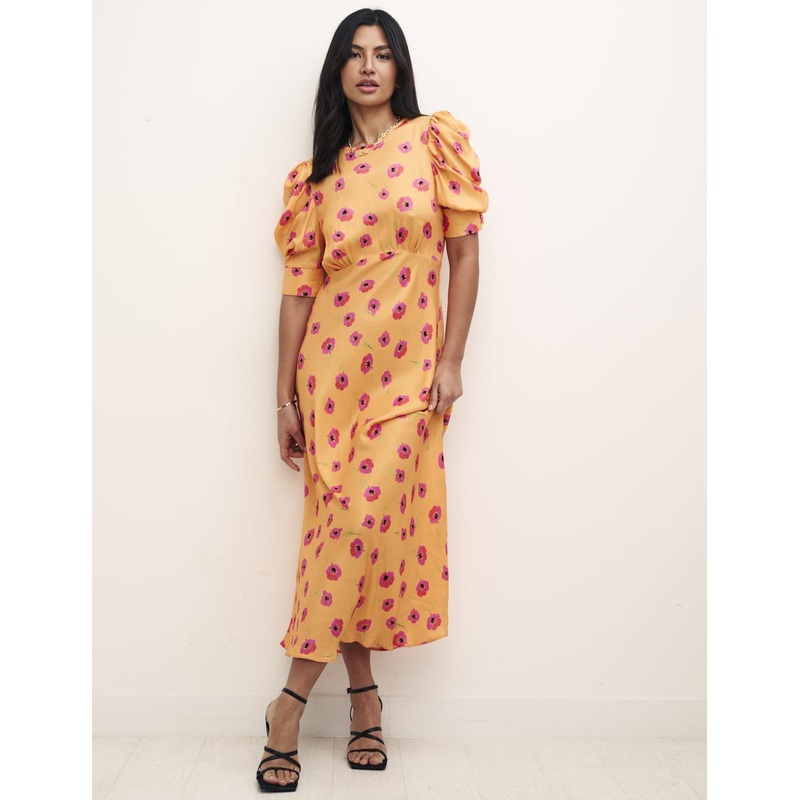 Let the sunshine in: blooming with poppies, our Moira midi is sure to see you through summer days. Soaked in yellow. The sleeves come lightly puffed and finished with a dainty row of four covered buttons. Slip into barely-there sandals.