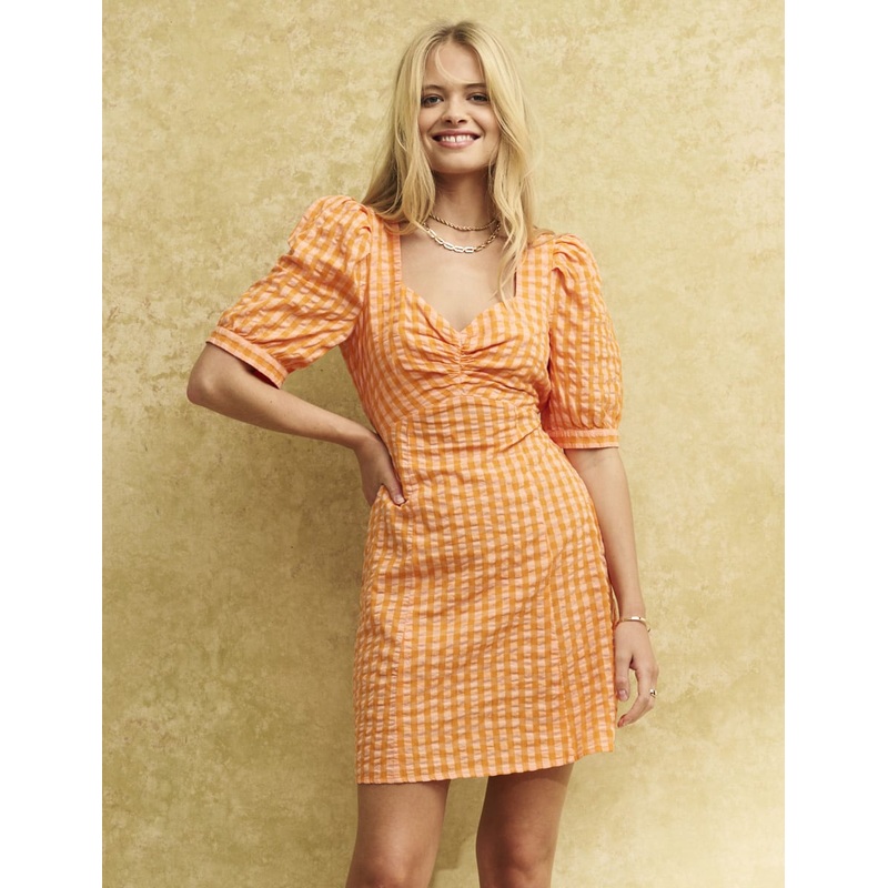 The official dress of summer, our perennial Penny mini is a vision in orange. Taking on a classic fit and flare frame, shes elevated by ruching on the sweetheart neckline. Wear yours with chunky slides. Sweetheart neck Short puff sleeves Concealed zip fast
