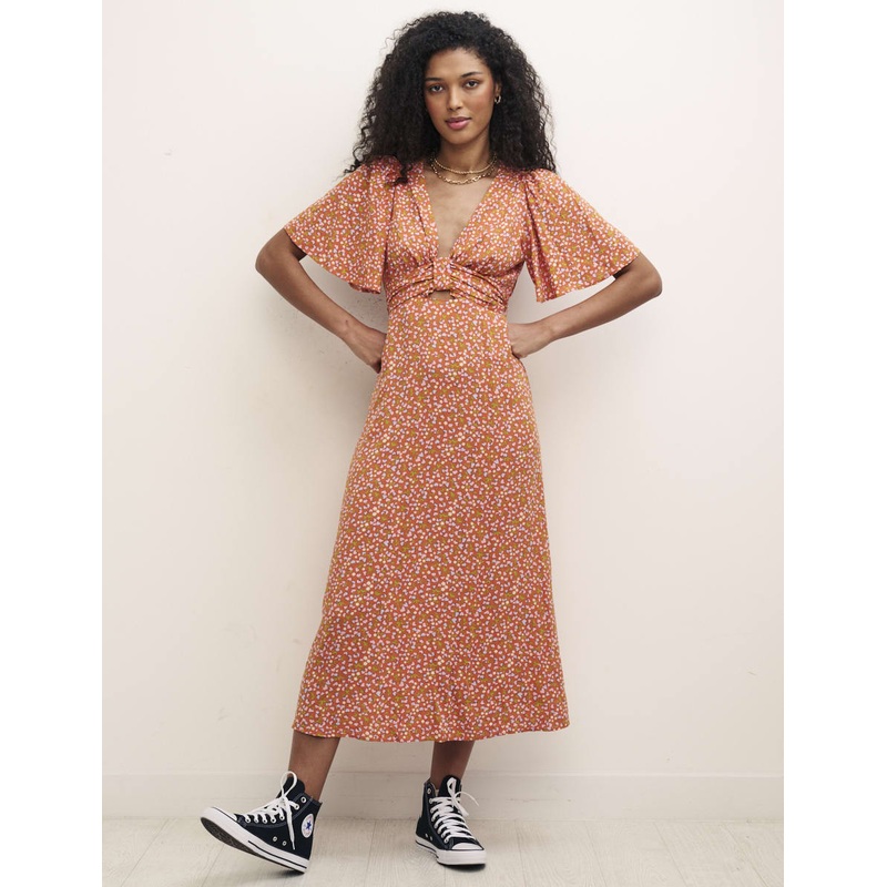 A midi with a difference. Fluted sleeves fall into a plunged knotted bodice, secured so a tiny cut out detail just about peeks through. Turn to reveal a soft tie-up bow. Wear as intended (in the city with trainers).Plunge v-neckFluted sleevesBelt loopsBack