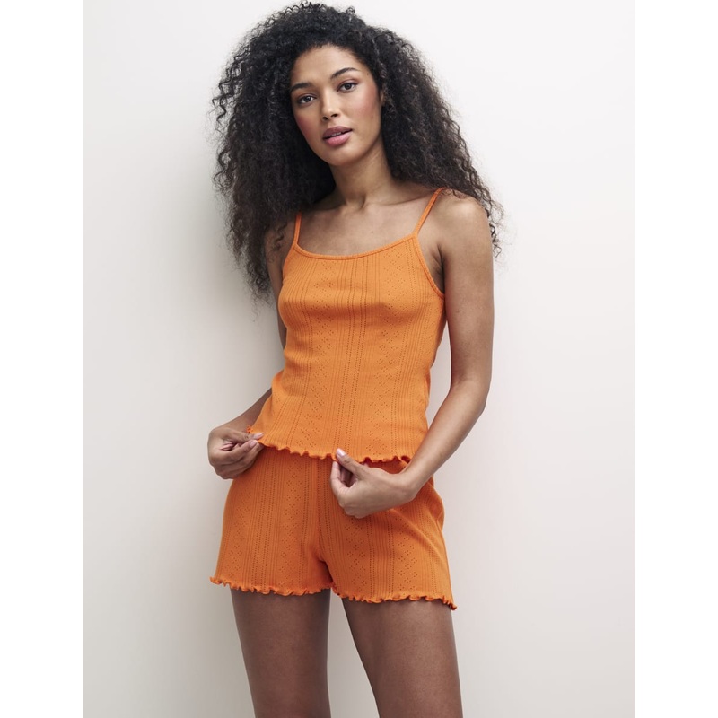 Stay in bed all day. This cami is super soft in orange pointelle with a frilled hem. Lounge around in it with the matching shorts.