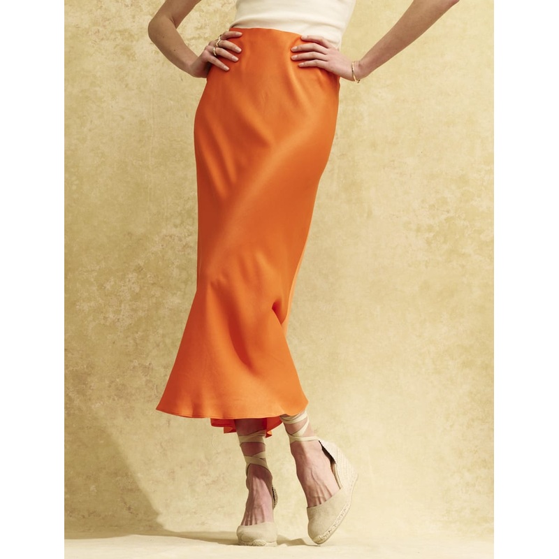Our sell-out Mila skirt is back in orange satin. It is a body-skimming cut that flares at the hem. Style yours with espadrilles for sun-filled events. Elasticated waist Bias cut