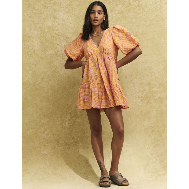 Making a statement in pink and orange stripes, our Vienna smock dress calls for days spent in the sun, whether its at home or on foreign shores. She then plunges to a low v-neck before flipping into a tiered skirt with tie detailing to the back. Were wearing ours with high tops for sightseeing.