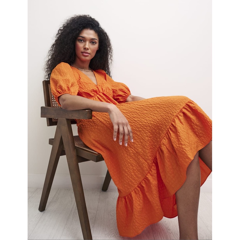 When it comes to creating an ultra-feminine and flattering mood, our orange Amy midi dress knows a thing or two. Shes designed with comfort in mind thanks to the breathable fabric and effortless smock shape. The puff sleeves and tiered hem imbue the style