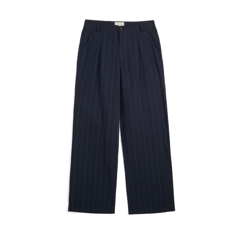 The Orsman trouser is a wide-leg style with single pleats for a contemporary silhouette. This iteration has been cut from a lightweight cotton and linen blend with a subtle stripe detail. Can be worn as separates or as part of a suit.
