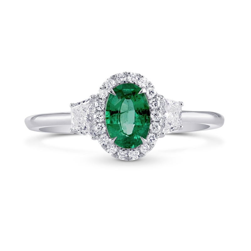 Oval Green Emerald & Trapezoid Diamond Halo Ring