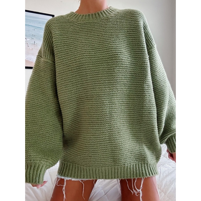 Chunky ribbed knit pullover sweater with a round neck and long sleeves. The cuffs and the neck line are both ribbed.