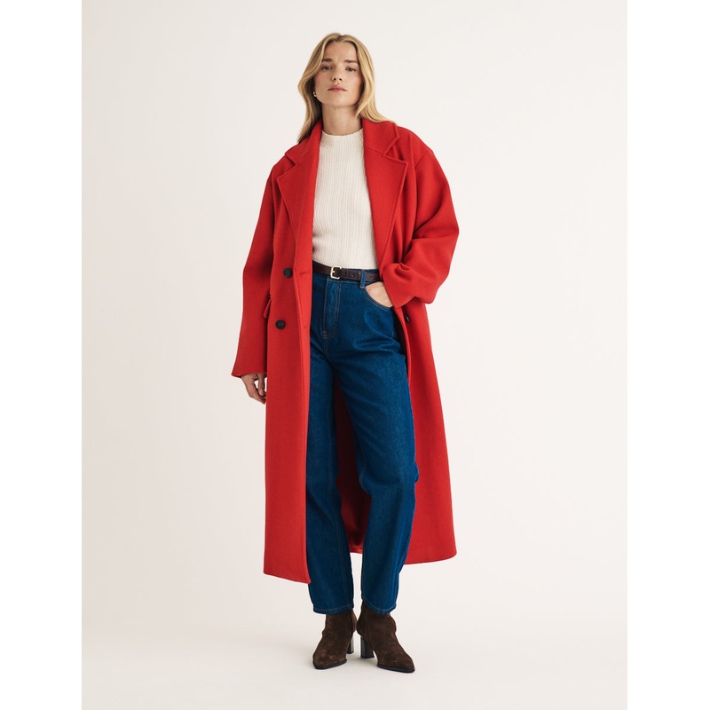 Red alert! This cool-girl coat comes with a longline cut and in statement scarlet. We cant get enough of its classic collar, double breasted buttons and pockets for all your essentials. Were wearing ours with denim and boots.