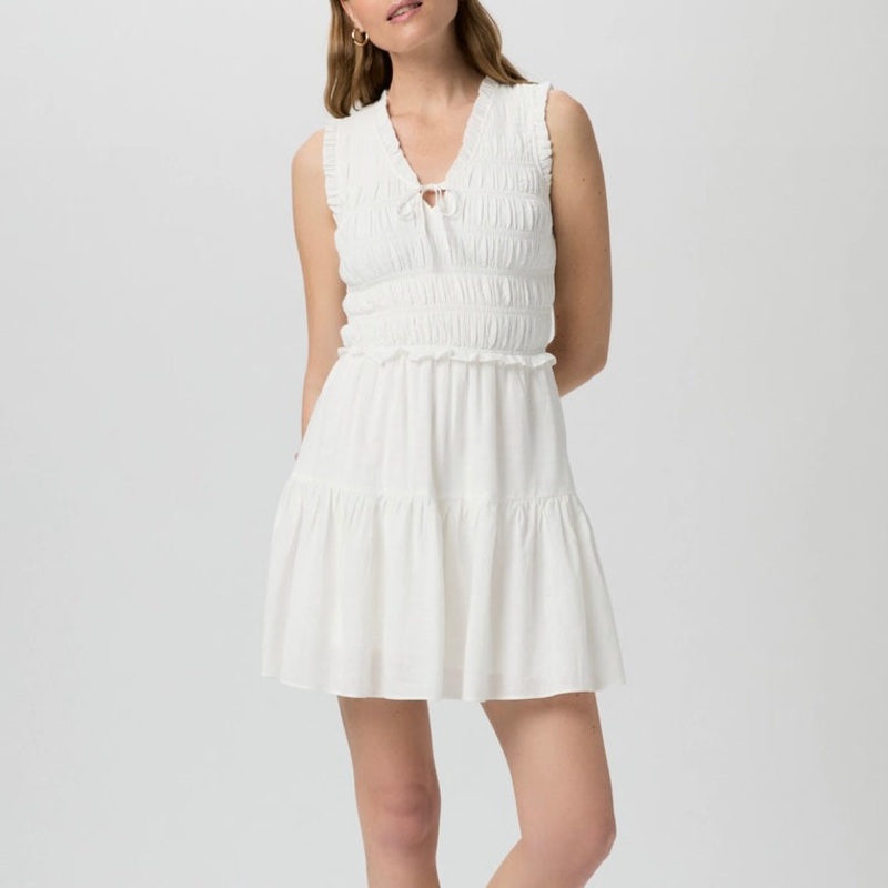 Paige Fraise Dress in White. Crafted from a light and airy cotton/rayon material in white, this sleeveless smocked mini dress is designed with a v-neckline with a tie detail and a tiered skirt. Pair the Fraise Dress with sandals during the day and heels at night for an effortlessly chic look.