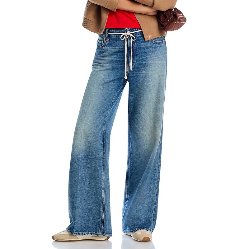 Paige Zoey Wide Leg in Jazz Club. This high-rise wide leg comes in a medium wash with lived-in details and a 31 inseam. Design details include a natural drawcord tie waist, vintage contrast hardware, and a stitch detail on the waistband. This pair is craft