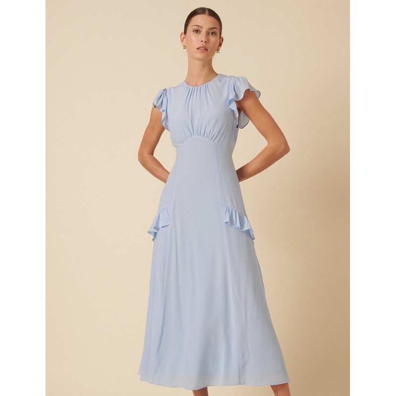 Feeling blue? This midi dress is a versatile piece for any occasion. Featuring a flowing silhouette and cap sleeves, dont miss the surprise open-back detail for an extra touch of sophistication. Just add heels. Crew neck Short sleeves Concealed zip fasteni