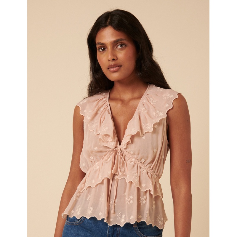 Frill seekers only. In a soft pink shade, this crinkle chiffon top is embroidered all over with ruffle trims, shirring and tie detail at the v-neck. V-neck String tie detail Size tip: we recommend your usual size