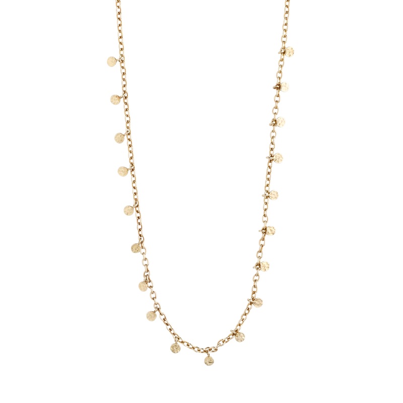 Feminine gold-plated necklace with small round polished pendants along the chain. The delicate necklace is 40 cm long with a 9 cm extension chain. The design was inspired by classic exotic jewellery, and the necklace is the perfect contrast to an edgy outf