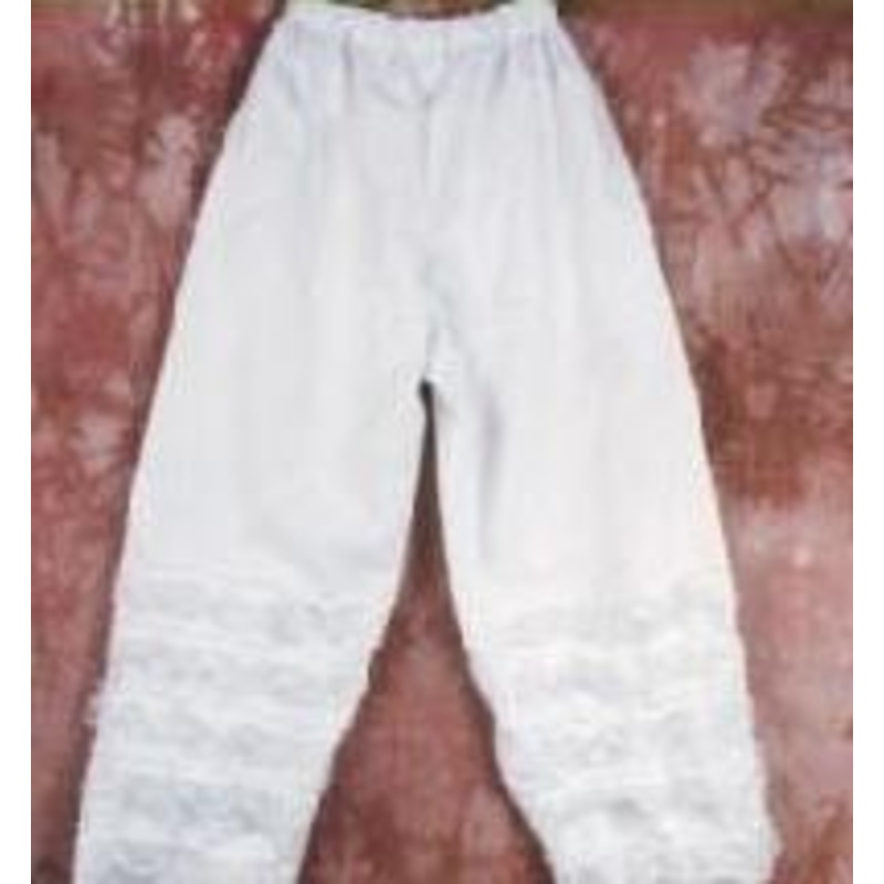 A little peek-a-boo under the skirt.Excellent For Alice, Bo-peep, Clowns, Victorian, Western Lady or Ballgowns.White cotton with lace ruffles on legs.Size: M (8-10), L (12-14)