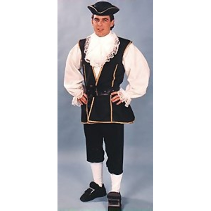 Includes: Black cotton vest w/gold metallic trim, white cotton shirt & lace jabot, black elastic waist knit pants, socks, and black vinyl belt.