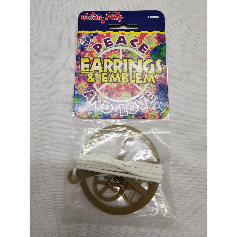 Peace & Love Earrings & Emblem NecklaceComplete your Hippie or war protester costume with these Peace Sign earrings and matching necklace! Groovy! The Peace Sign earrings are made of a gold plastic and are clip on, so everyone can wear them.Color: GoldOne