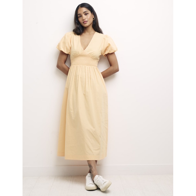 A cool choice for balmy days, Sansas structured with a shirred waist panel finished with zig zag stitching and stylish puff sleeves. She also comes with pockets. Wear her when youre running around in the warmth. Shes perfect for pottering.
