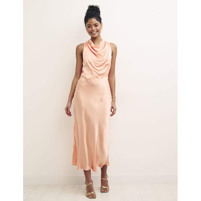 Walk down the aisle with the NC bridal party collection. Cut from sunkissed peach satin with an elegant draped neckline, this midaxi is endlessly flattering. Pin hair up to show off the subtle keyhole back detail finished with a twin set of covered buttons