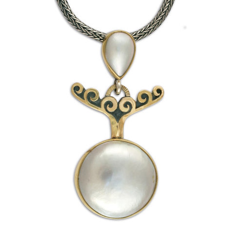 An illustrious pearl plunges into the depths from which it came. A golden splash emerges forth from the top, perfectly framing yet another pearl, the origin of the pearl’s display. The entirety of this piece suspends from a hand woven chain of sterling silver.