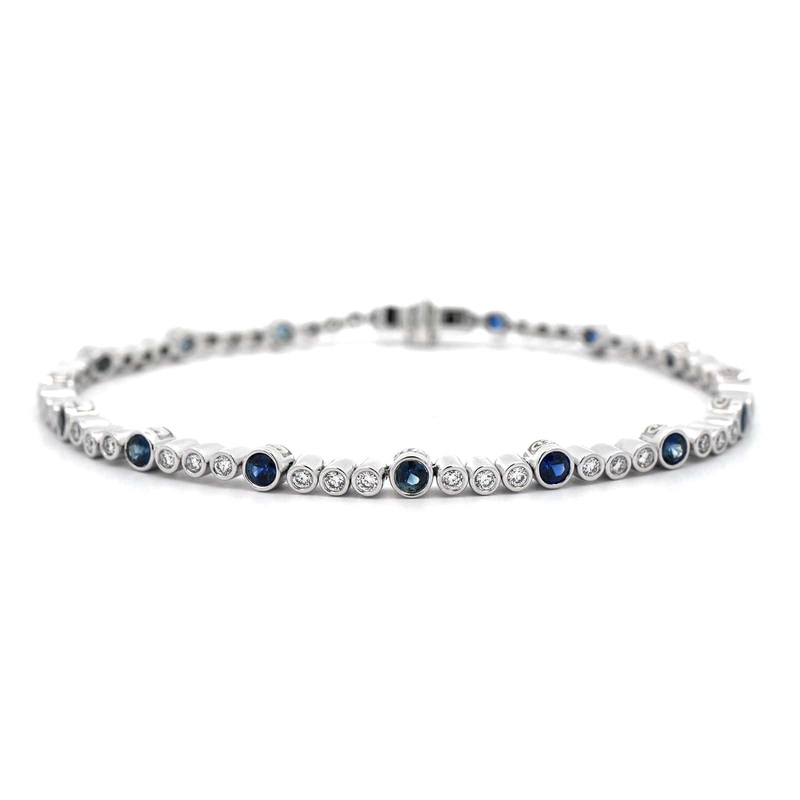 18k white gold bracelet with blue sapphires and round diamonds.