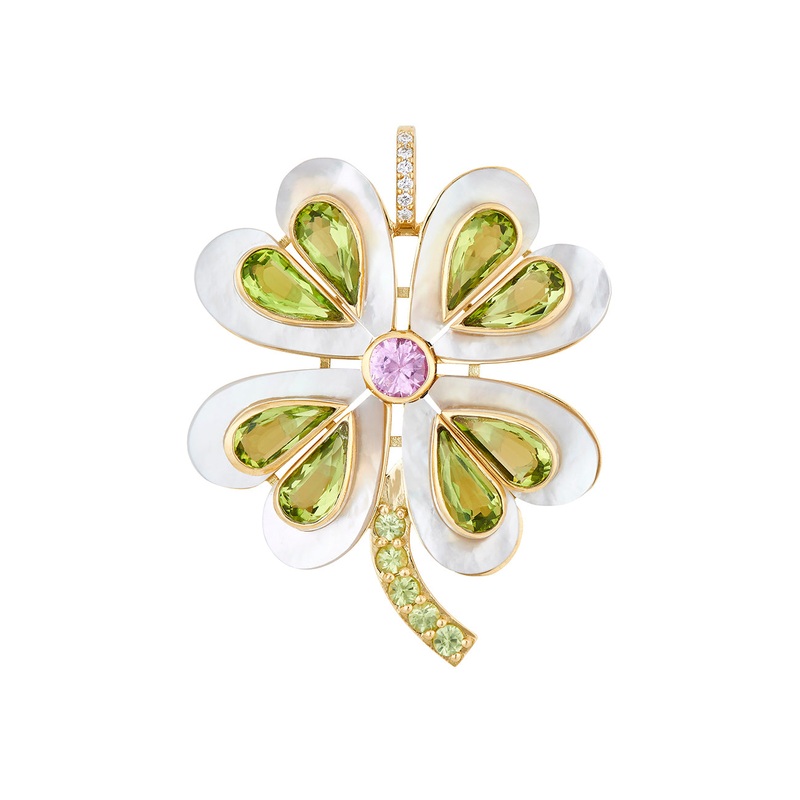 18k gold Jolie clover pendant with peridot, pink sapphire and a pave diamond bail