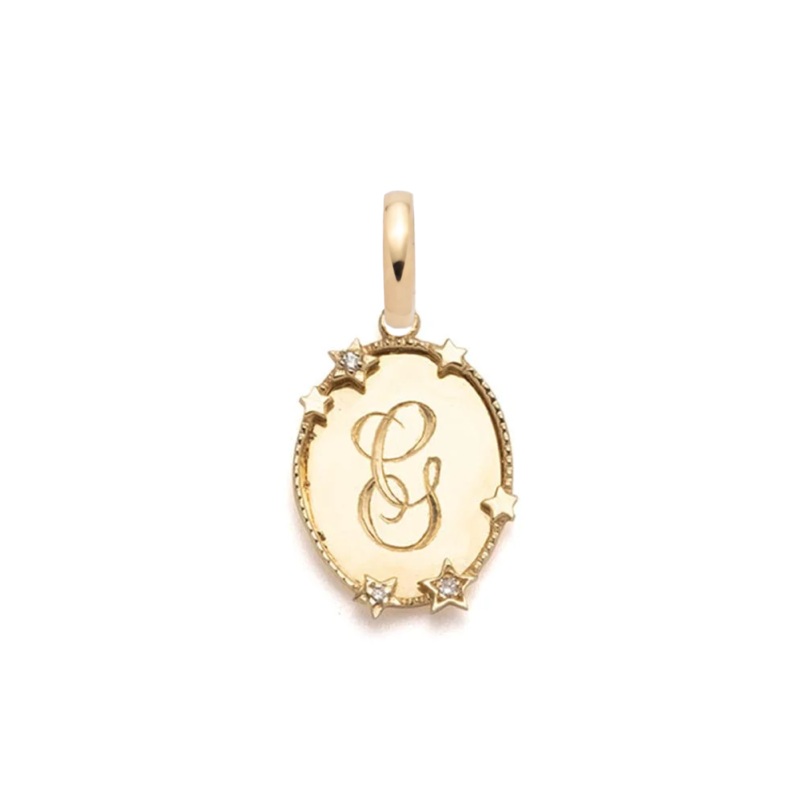 DescriptionCrafted in 18-karat Yellow Gold, this oval charm medallion is surrounded by stars and has a center area intended to engrave an initial of your choice, add it to any chain for a touch of personalization and as a tool to tell your story. The stars